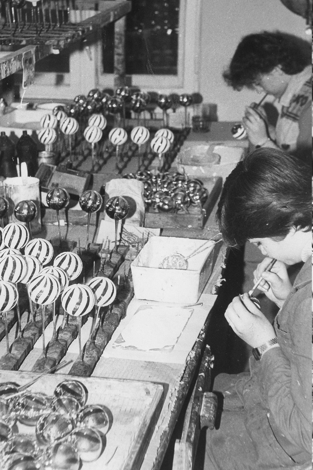 Dmuchaczki rozgrzewały długie szklane rurki do ich plastyczności, wkładały do formy i dmuchając w odciąg nadawały ozdobom wymagany kształt. Srebrzaczki wlewały w otwór bombek odpowiedni roztwór, dla nadania im srebrnej warstwy, dzięki czemu łatwiej je było zmatowić i pomalować. Malowanie czy też dekorowanie odbywało się w sposób mechaniczny i ręczny, a na koniec gotowe produkty trzeba było bardzo starannie zapakować, obchodząc się z nimi jak z przysłowiowym jajkiem.