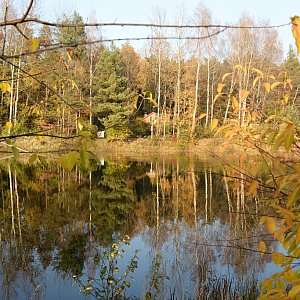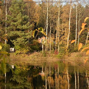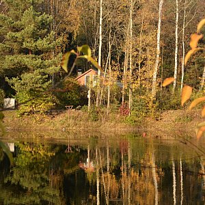 Od strony Miasteczka ktoś postawił ładny, drewniany domek blisko brzegu. Podziwiam za odwagę. Zbiornik zarasta i niestety nikt nie chce brać się za jego ratowanie. Inwestować w takim miejscu?