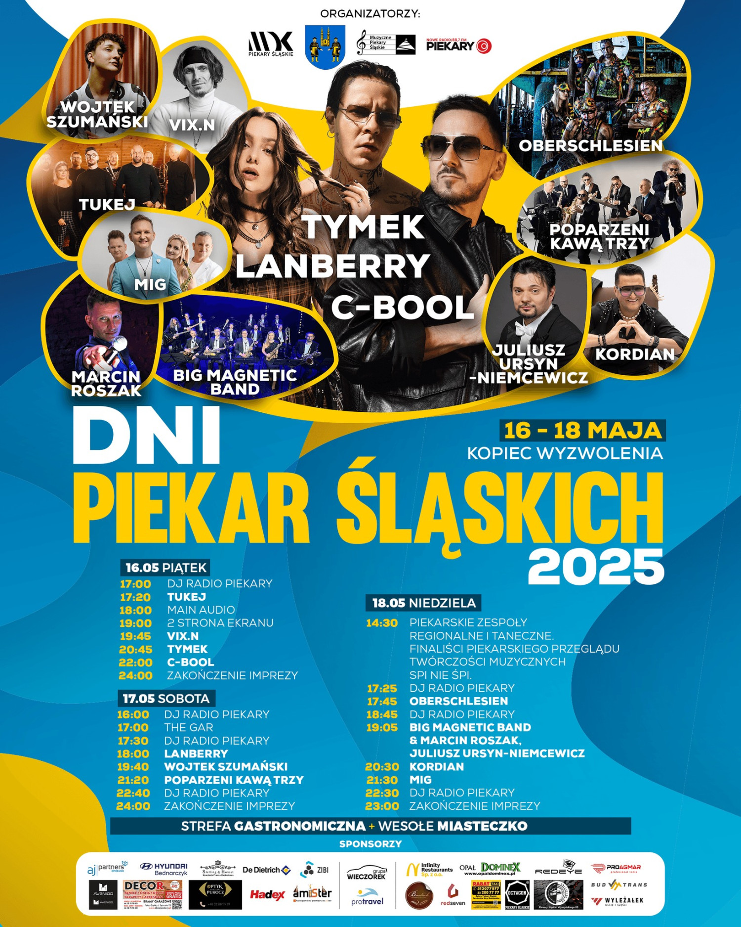 Start o godz. 14.30 – przemarsz oraz występ piekarskich zespołów regionalnych, sekcji tanecznych oraz finalistów Przeglądu Amatorskich Twórczości Muzycznych „SPI NIE ŚPI”. Następnie wystąpią: