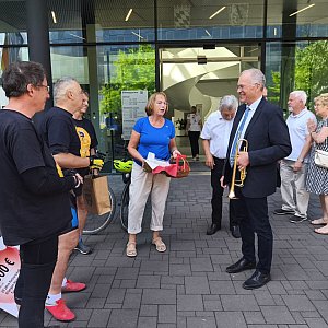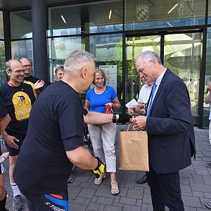 Rajd zakończył się w Erlangen w piątek przed południem. Rowerzyści zostali uroczyście powitani przez Wicestarostę Erlangen-Höchstadt Martina Oberle, który na ich cześć zagrał na trąbce „Odę do radości” – symbol wspólnoty i europejskiej integracji. W siedzibie tamtejszego Starostwa uczestnikom rajdu wręczono pamiątkowe statuetki – wyraz uznania za wysiłek, ale też za pielęgnowanie partnerskich więzi między regionami.