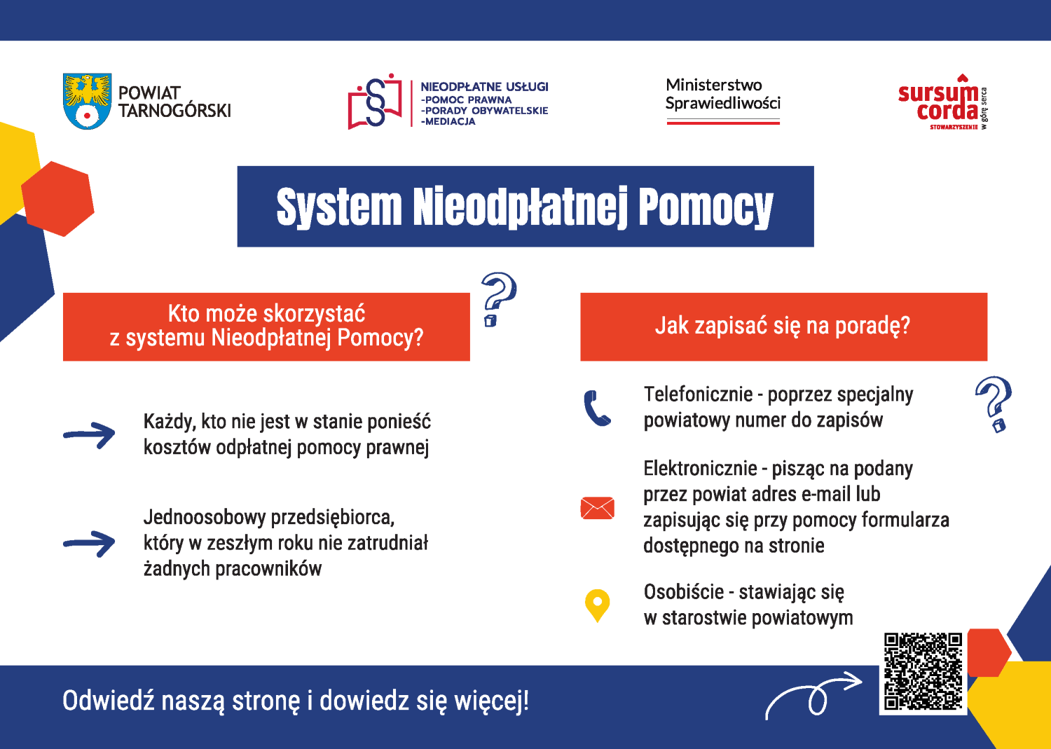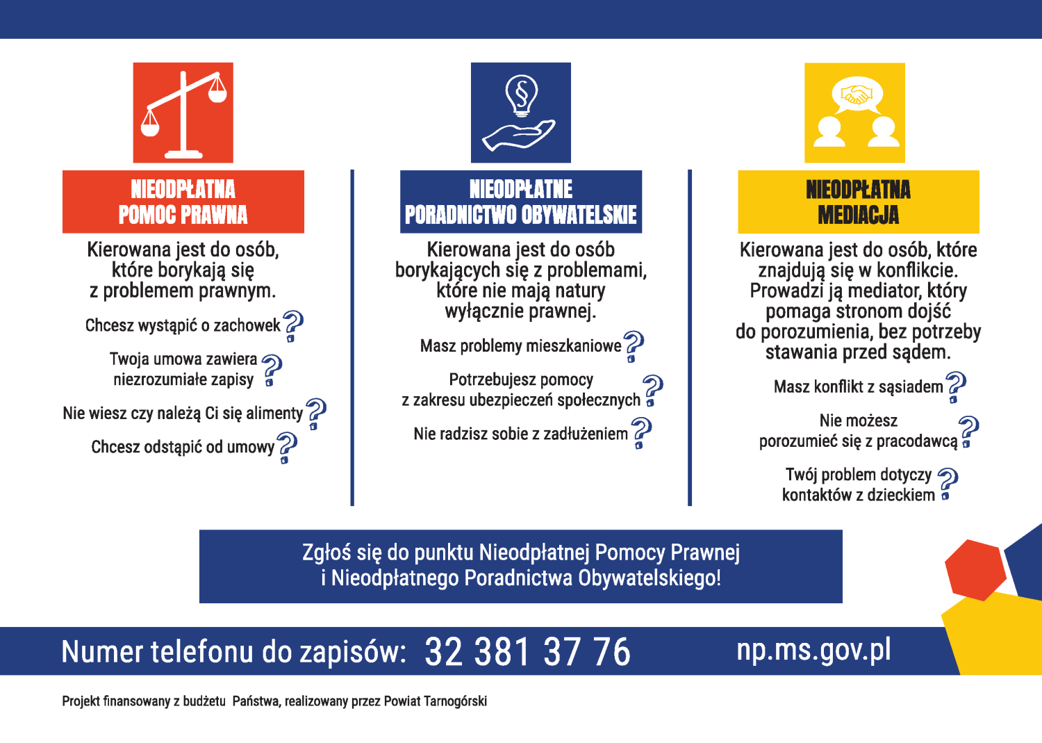 Skorzystaj z nieodpłatnej pomocy prawnej i poradnictwa obywatelskiego dostępnych na terenie Powiatu Tarnogórskiego. W naszych punktach uzyskasz bezpłatne i profesjonalne wsparcie od radców prawnych, adwokatów, mediatorów oraz doradców obywatelskich.